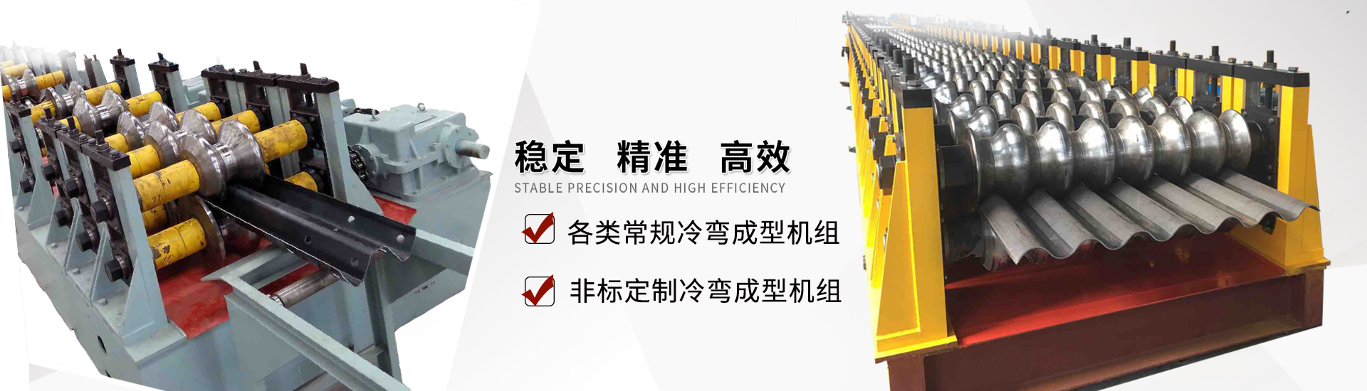 主要產品有抗震支架生產設備,高速公路鋼護欄板生產設備,涵洞波紋板成型機組,光伏支架生產設備,沖孔腳踏板生產線、電梯型材系列設備、電纜橋架系列設備、立體車庫系列設備、貨架型材系列設備、電氣柜型材系列設備等專用冷彎設備。
